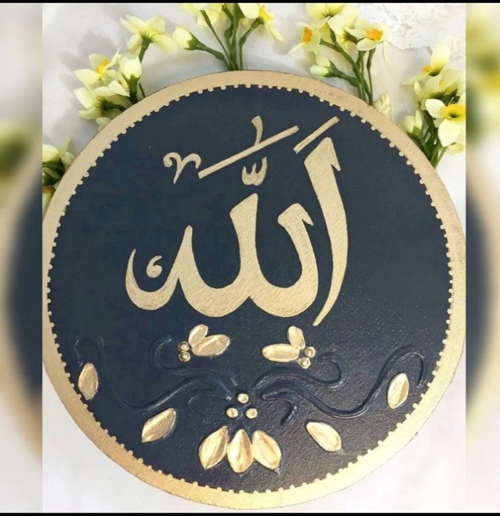 دیوارکوب الله ، کار شده روی بوم دایره ای به قطر ۲۵ سانتی متر میباشد . تماما" کار شده با دست. نقاشی برجسته ، و کار شده با تکسچر و رنگ اکریلیک و رنگ طلای مایع و تثبیت شده با اسپری فیکساتیو (تثبیت کننده رنگ )