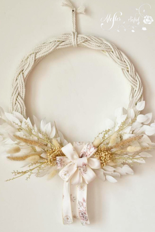 کار شده روی حلقه فلزی ۳۰ سانتی که با نخ مکرومه تزئین شده.از گلهای مصنوعی و گل خشک در اجرای این کار استفاده شده.این کار آماده ارسال میباشد.