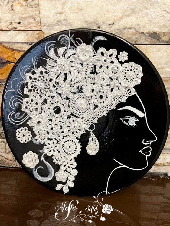 اجرا شده روی بشقاب سفالی، با رنگ اکریلیک ، قلاب بافی با دست و فیکس شده با وارنیش.