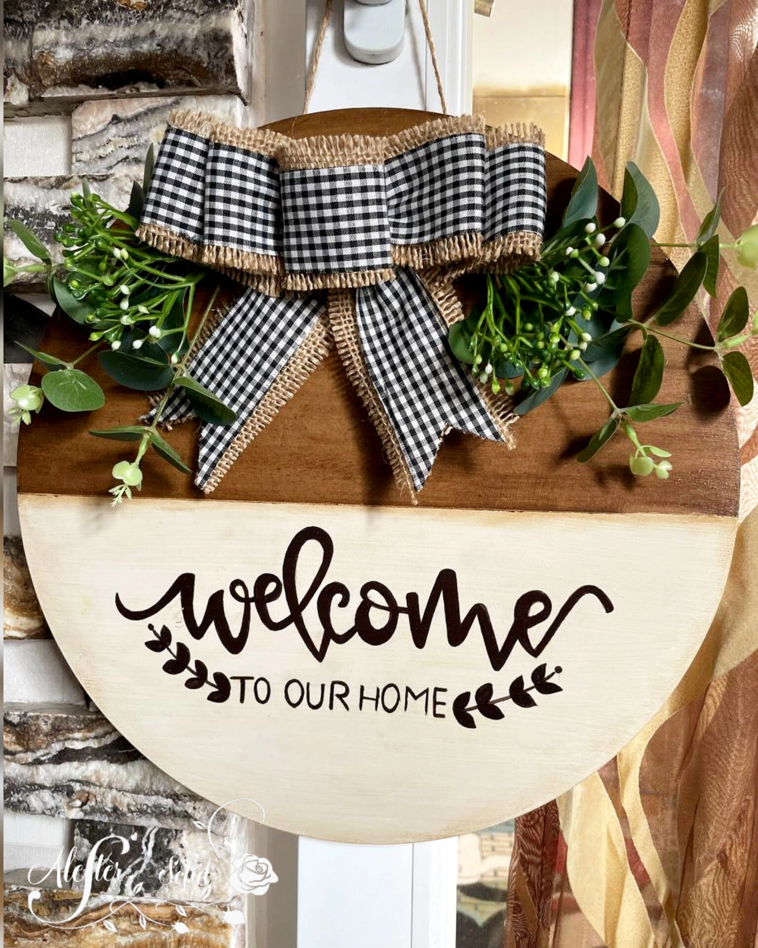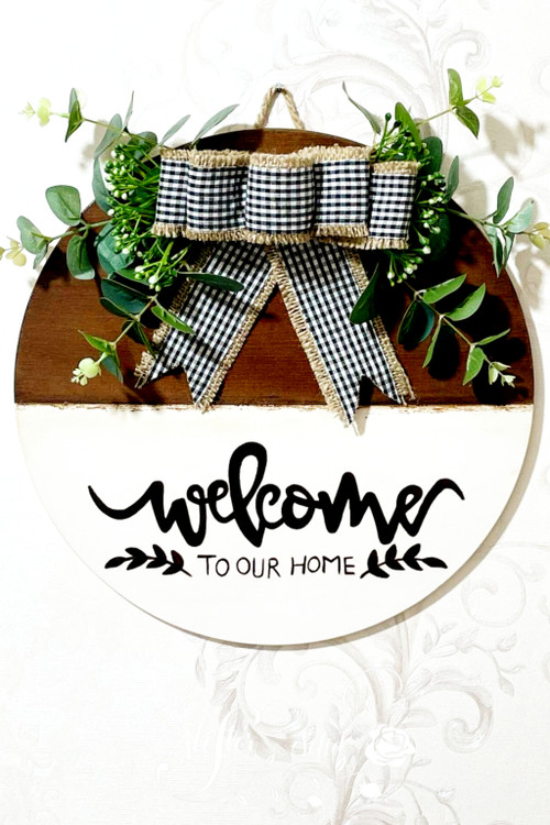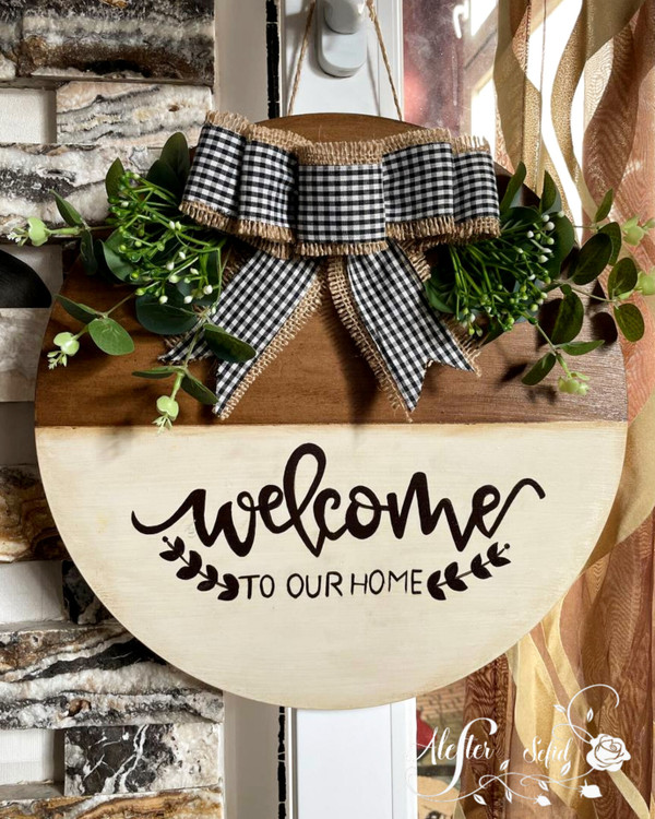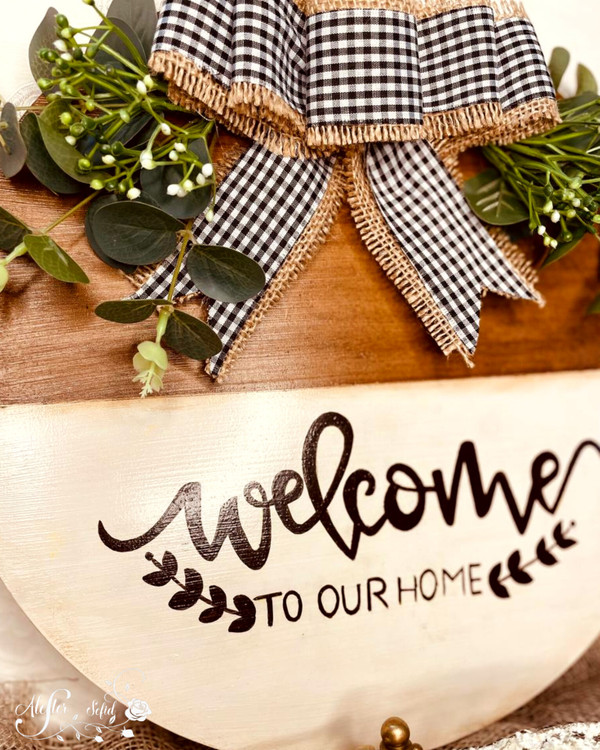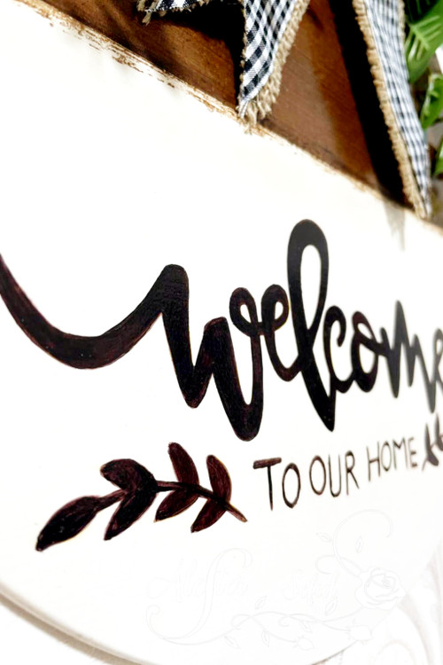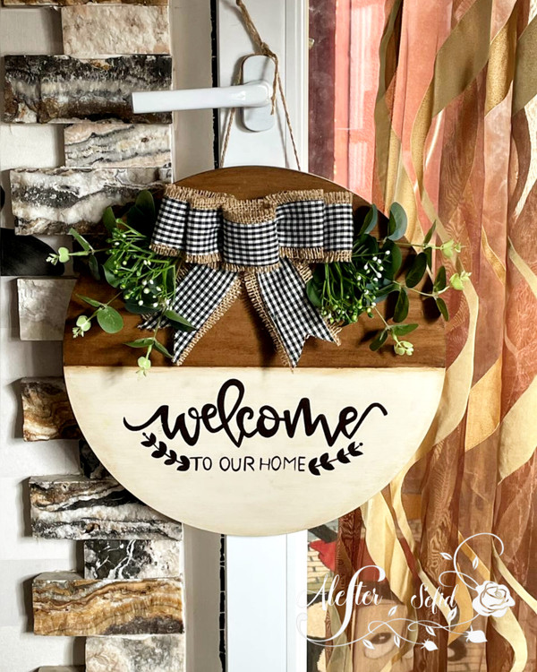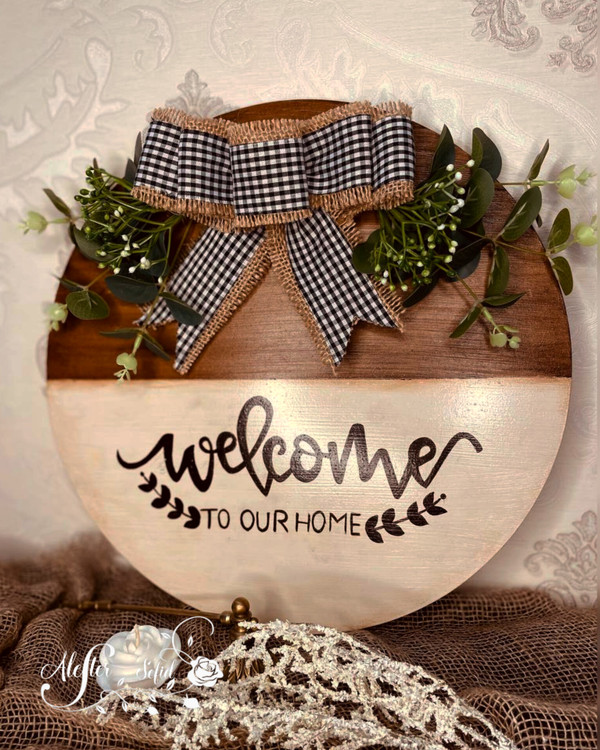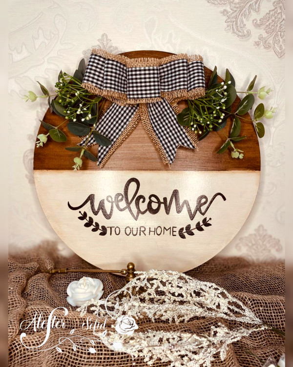 این کار روی بیس دایره ای شکل ام دی اف با قطر حدود ۳۵ سانت اجرا شده . تکنیک کهنه کاری ، دست نویس و استفاده از گلهای مصنوعی وارداتی.
